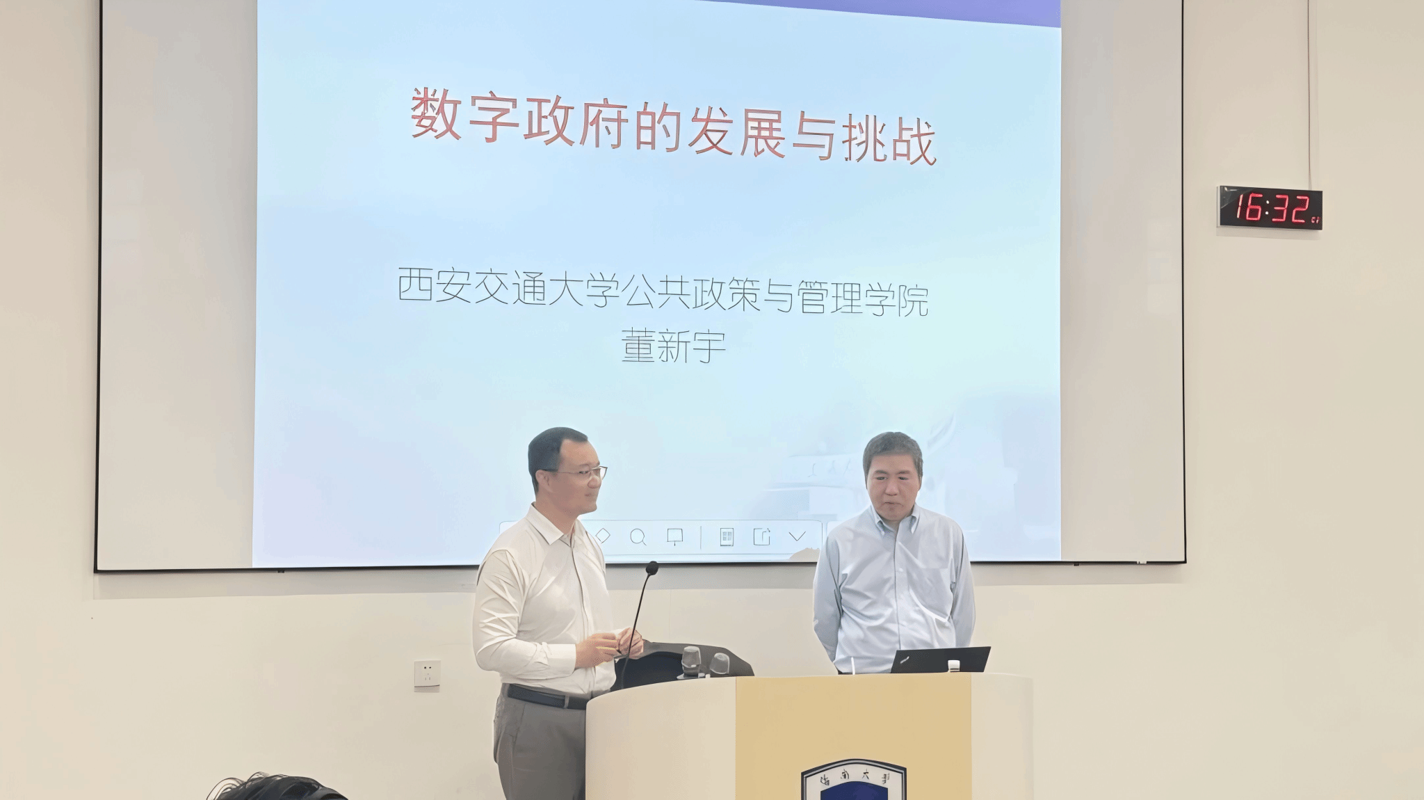2026年3月19日下午,我院“专家进课堂活动”在观澜湖校区3教A103教室顺利举行。本次活动特邀西安交通大学公共政策与管理学院党委书记董新宇教授做客课堂,为公共管理学科师生带来题为《数字政府的发展与挑战》的精彩授课。学院相关专业教师、研究生共同参加本次学习交流。本次活动由副院长刘海洋教授主持。